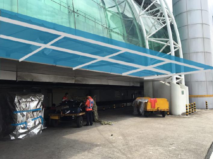 航站楼东连廊外场1号、5号、7号预检机上方用铁皮搭建的临时雨棚,下雨时和刮风时存在安全隐患,也严重影响机场服务形象,现对航站楼东连廊外场1号、5号、7号预检机上方新建62m*2.2m不锈钢PC阳光板雨棚。